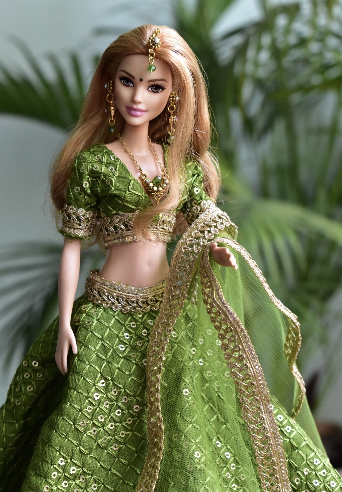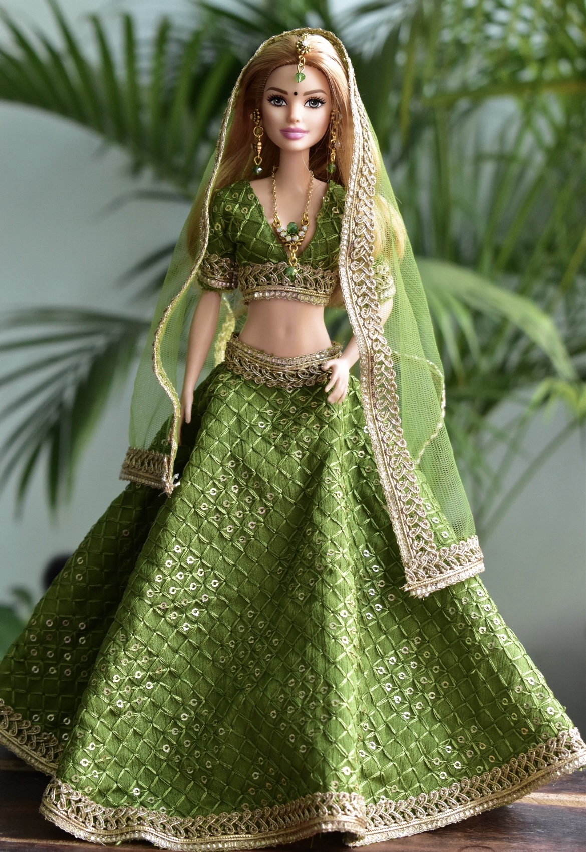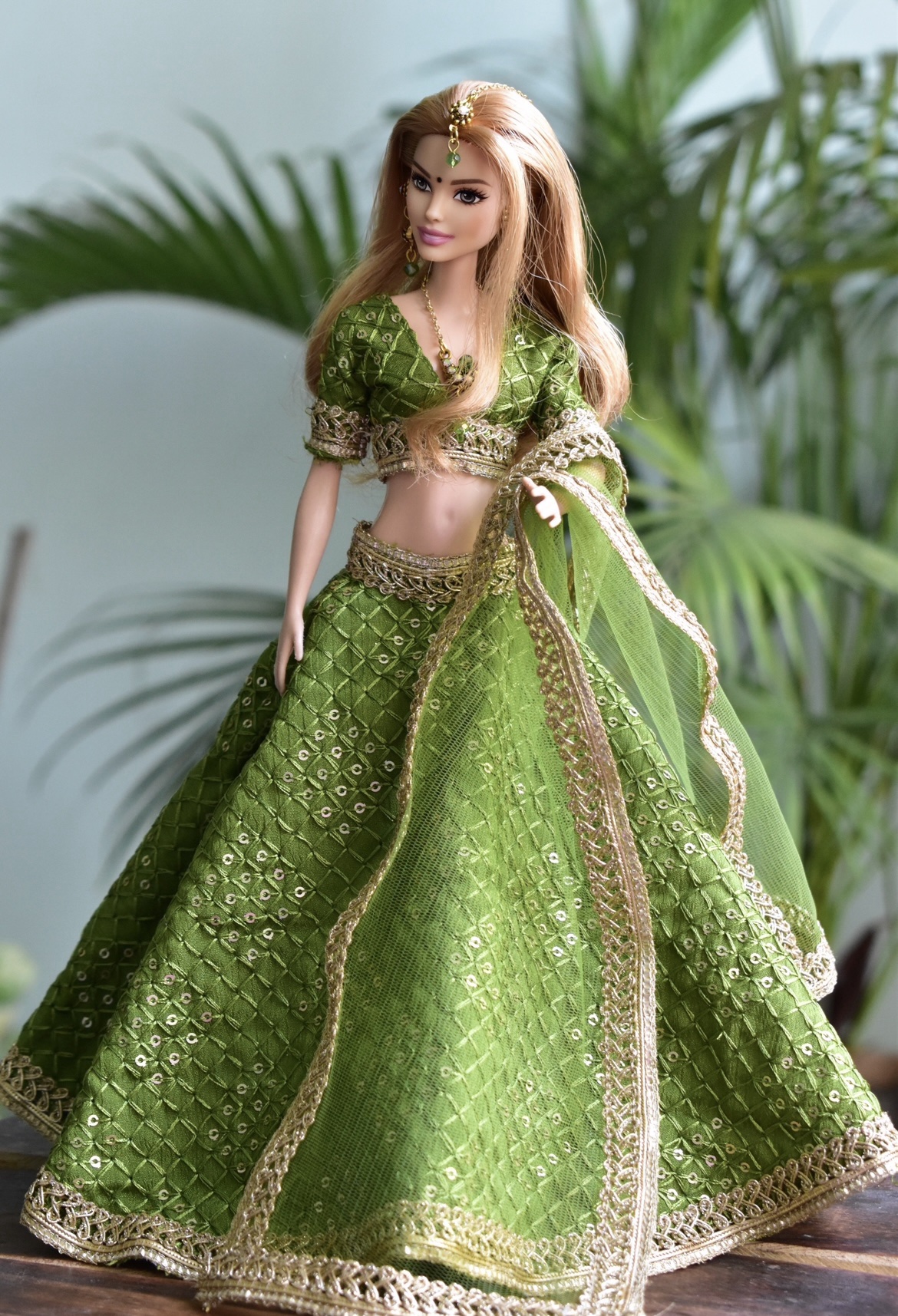 Green gold lehenga for a regular body type doll.