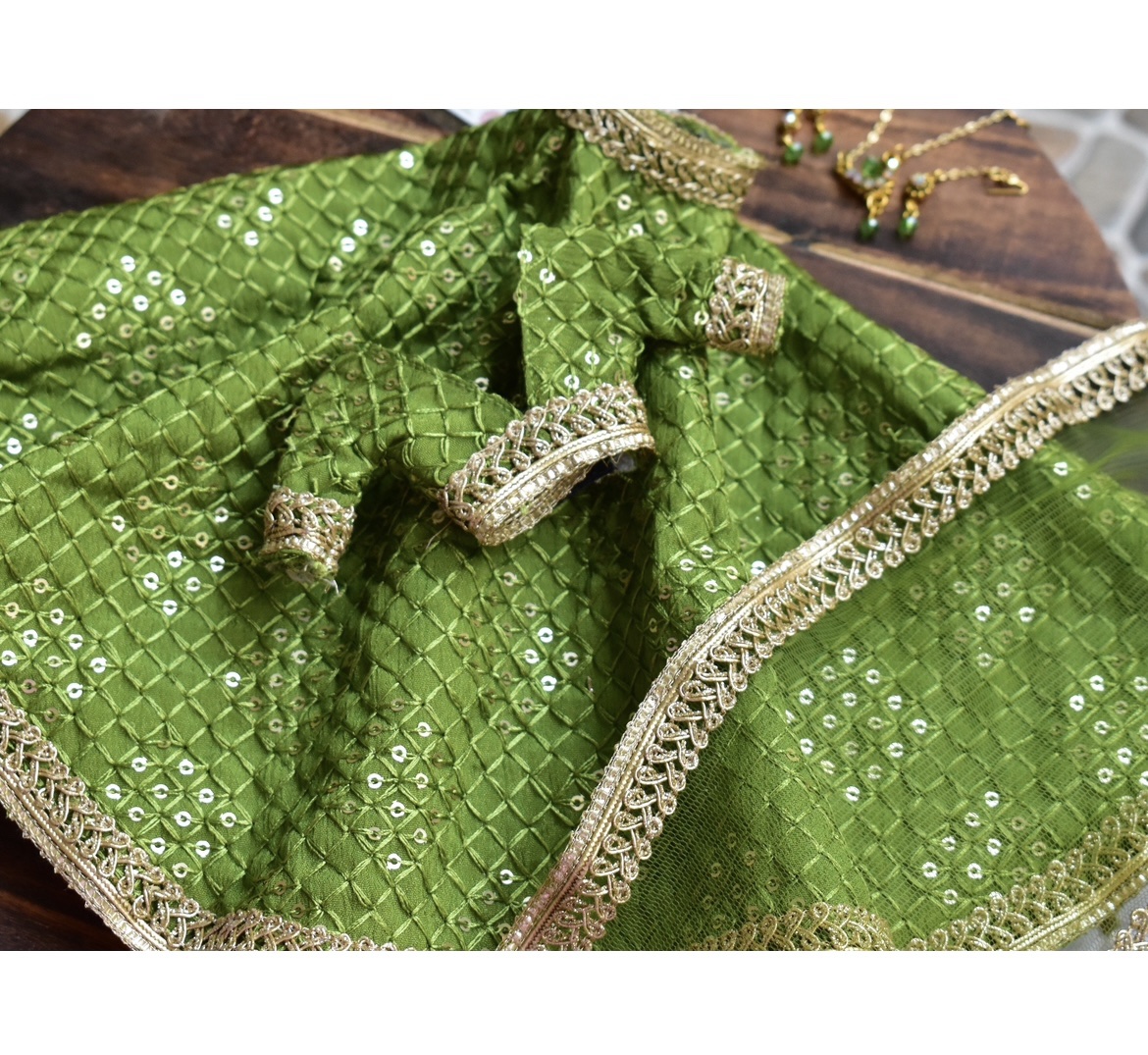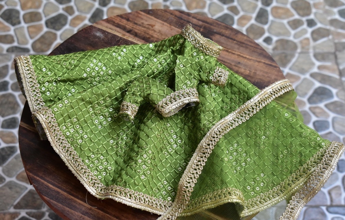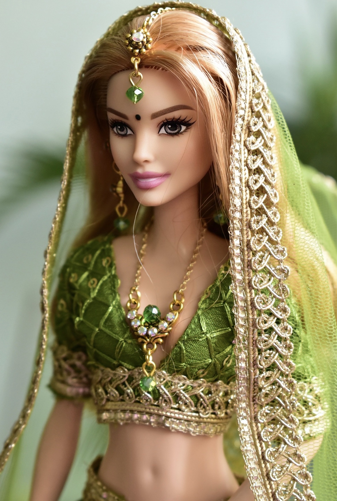 Green gold lehenga for a regular body type doll.