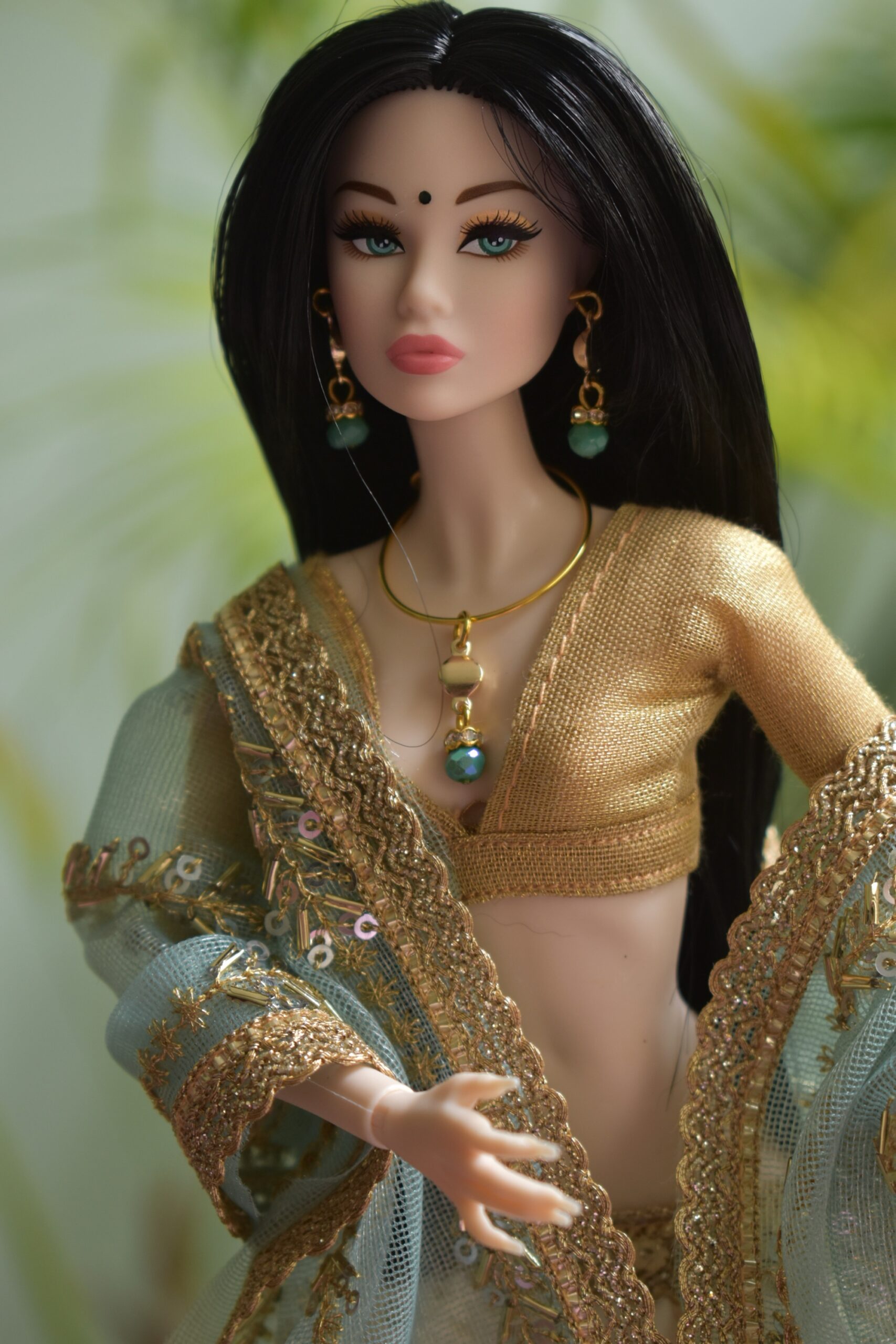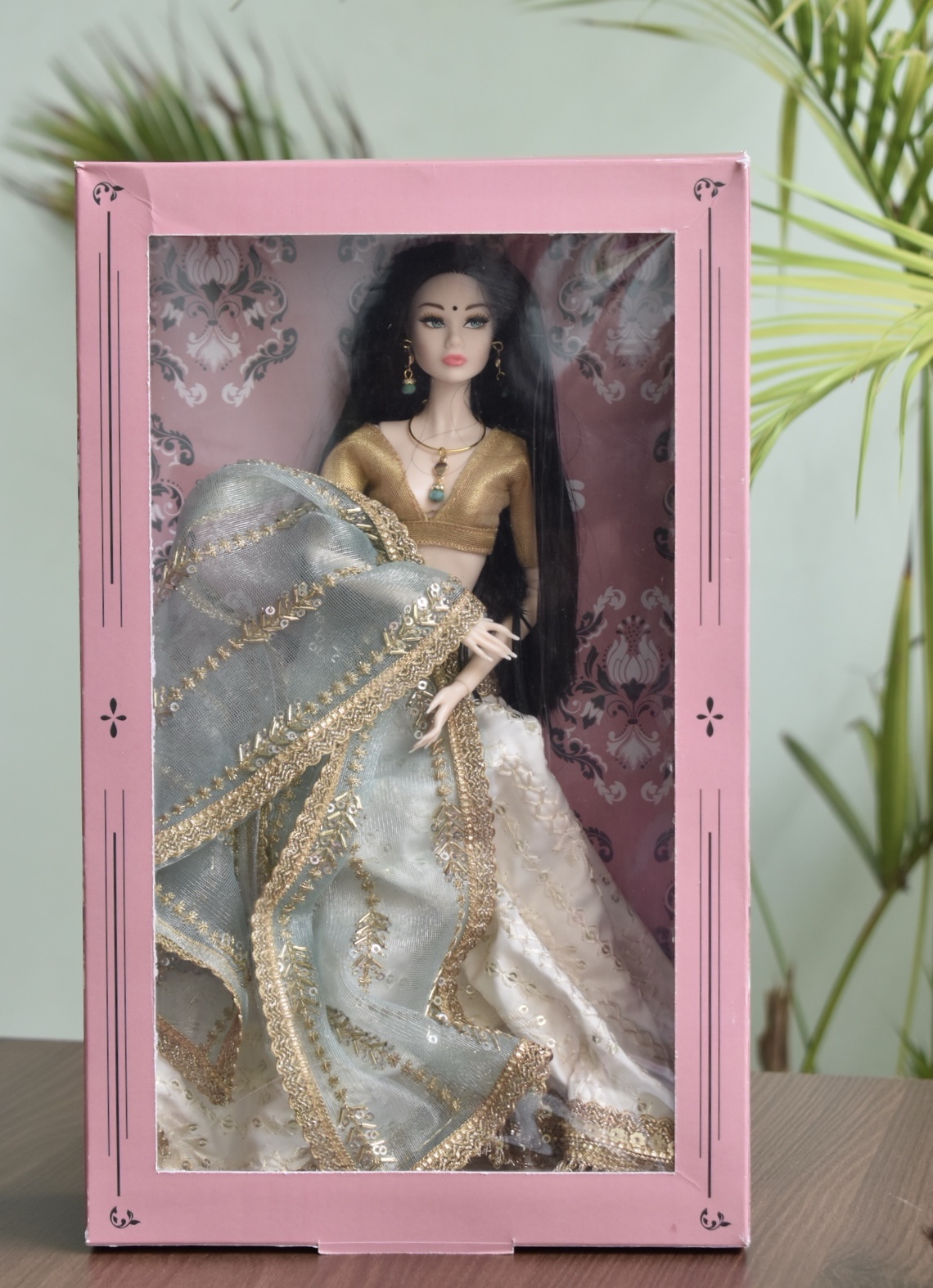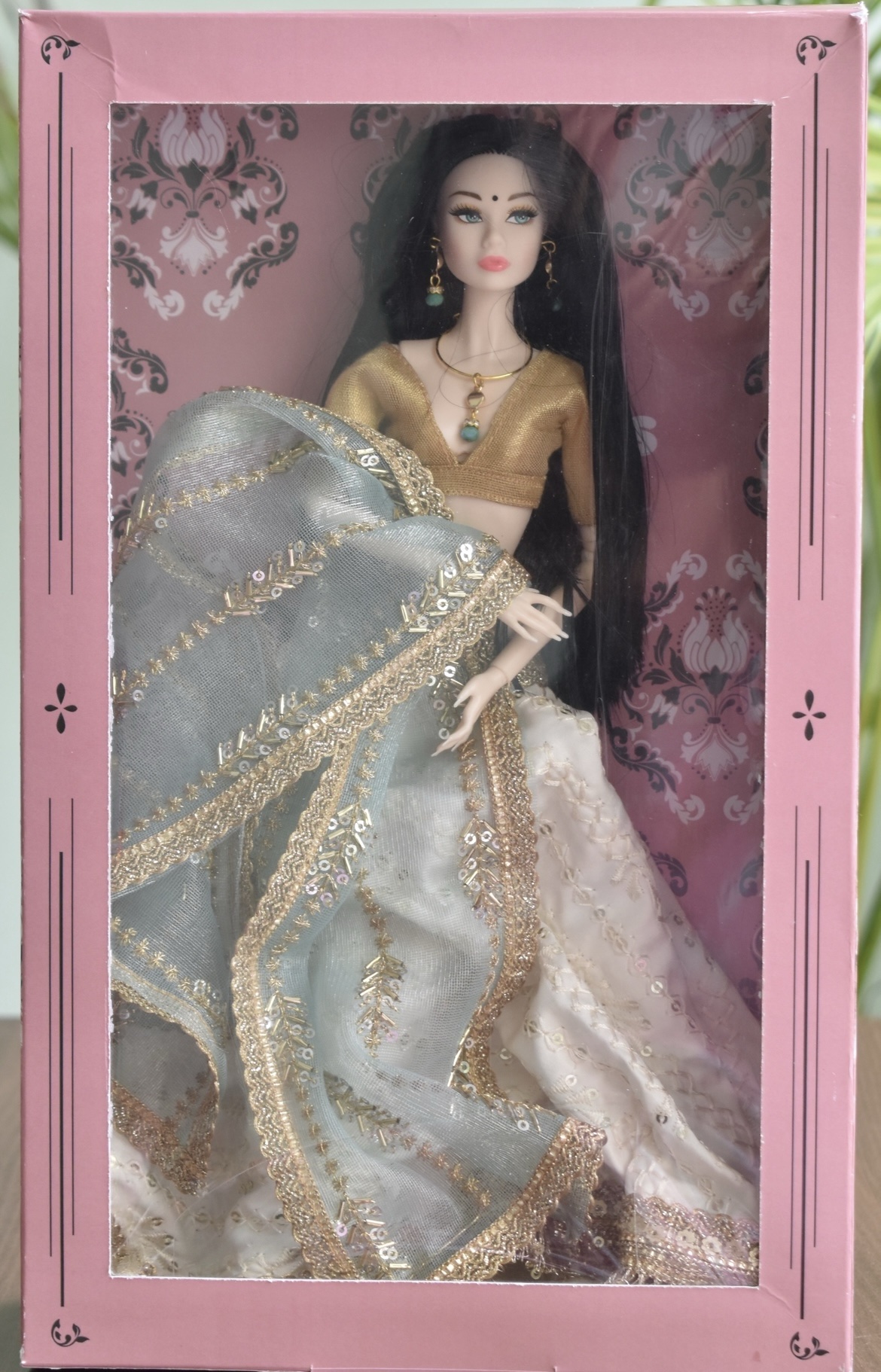 A brand new 33cm tall supermodel body-type doll, elegantly dressed in beautifully handcrafted traditional Indian clothing and intricate accessories. Each doll comes securely packaged in a sturdy, protective box.