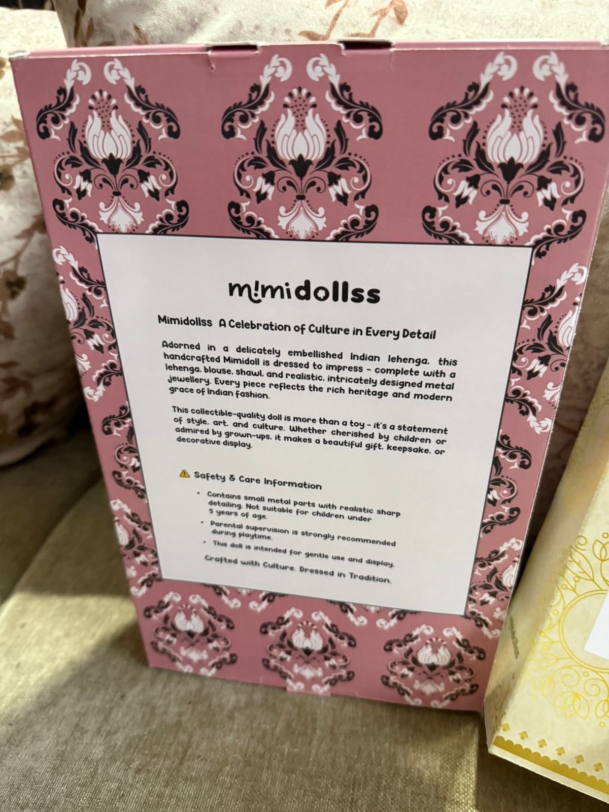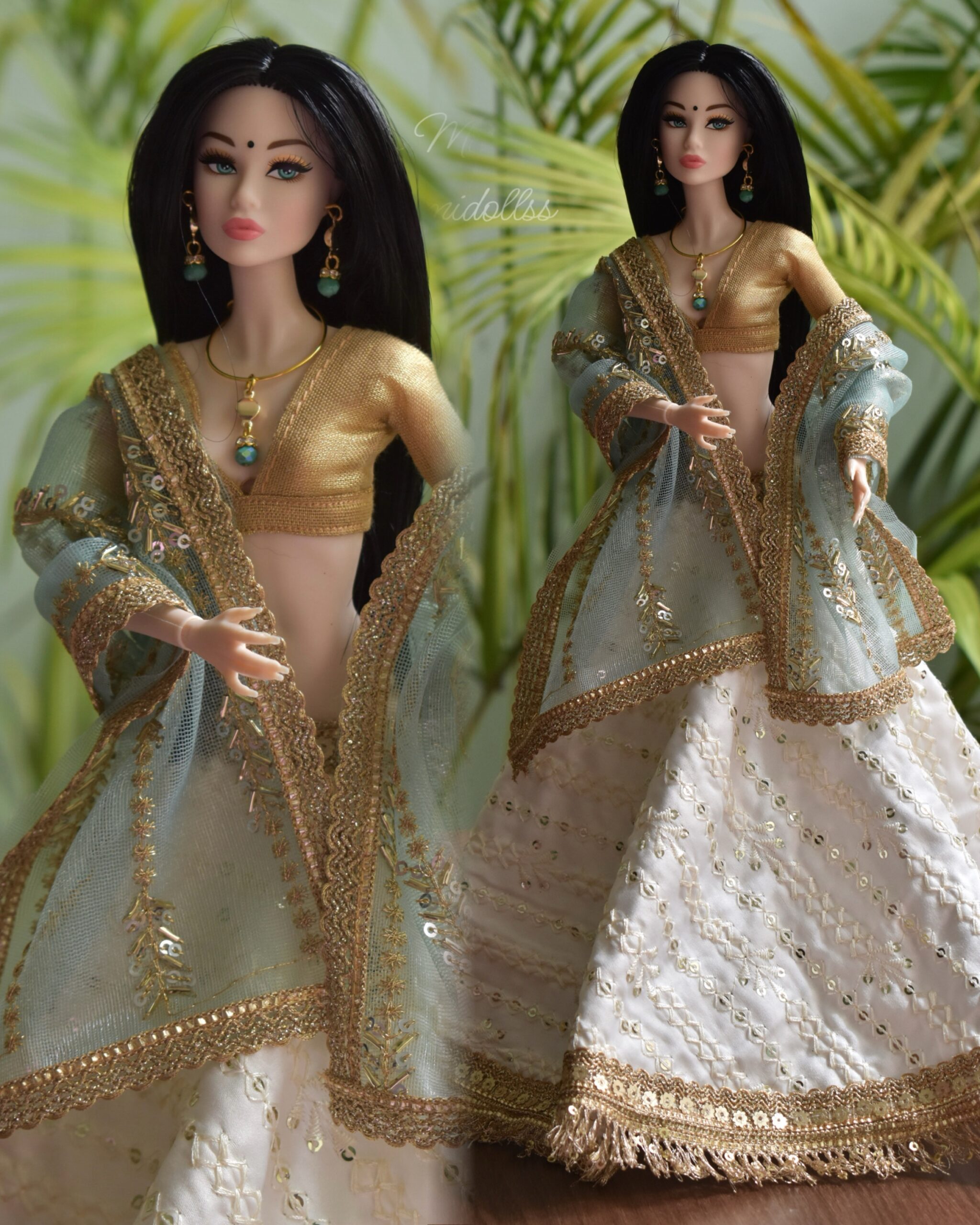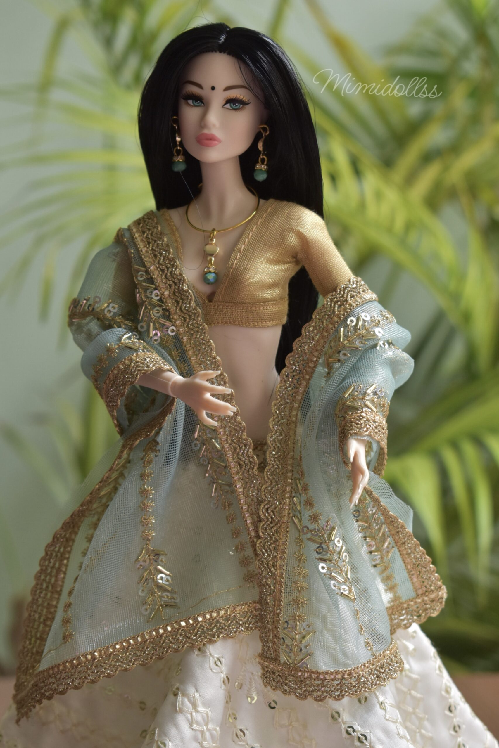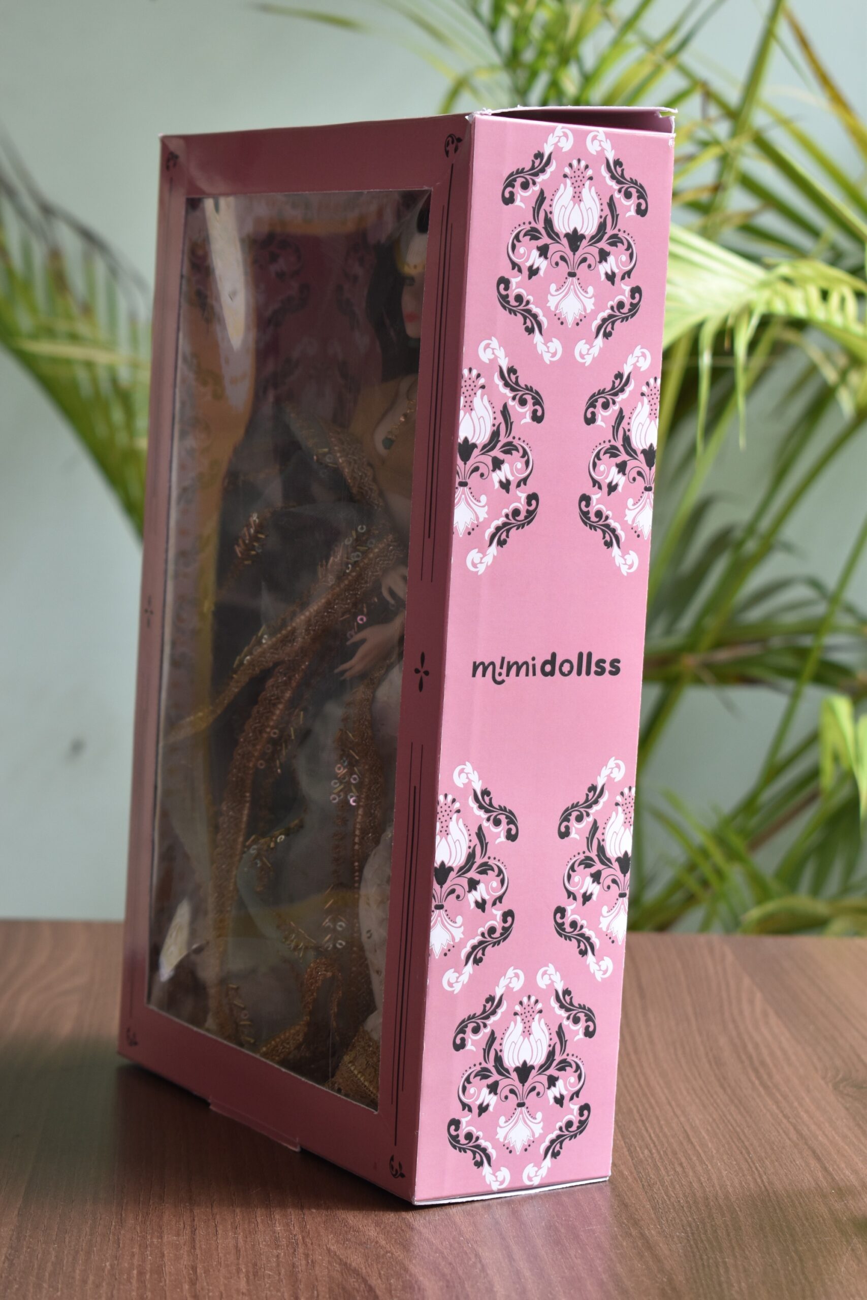 A brand new 33cm tall supermodel body-type doll, elegantly dressed in beautifully handcrafted traditional Indian clothing and intricate accessories. Each doll comes securely packaged in a sturdy, protective box.