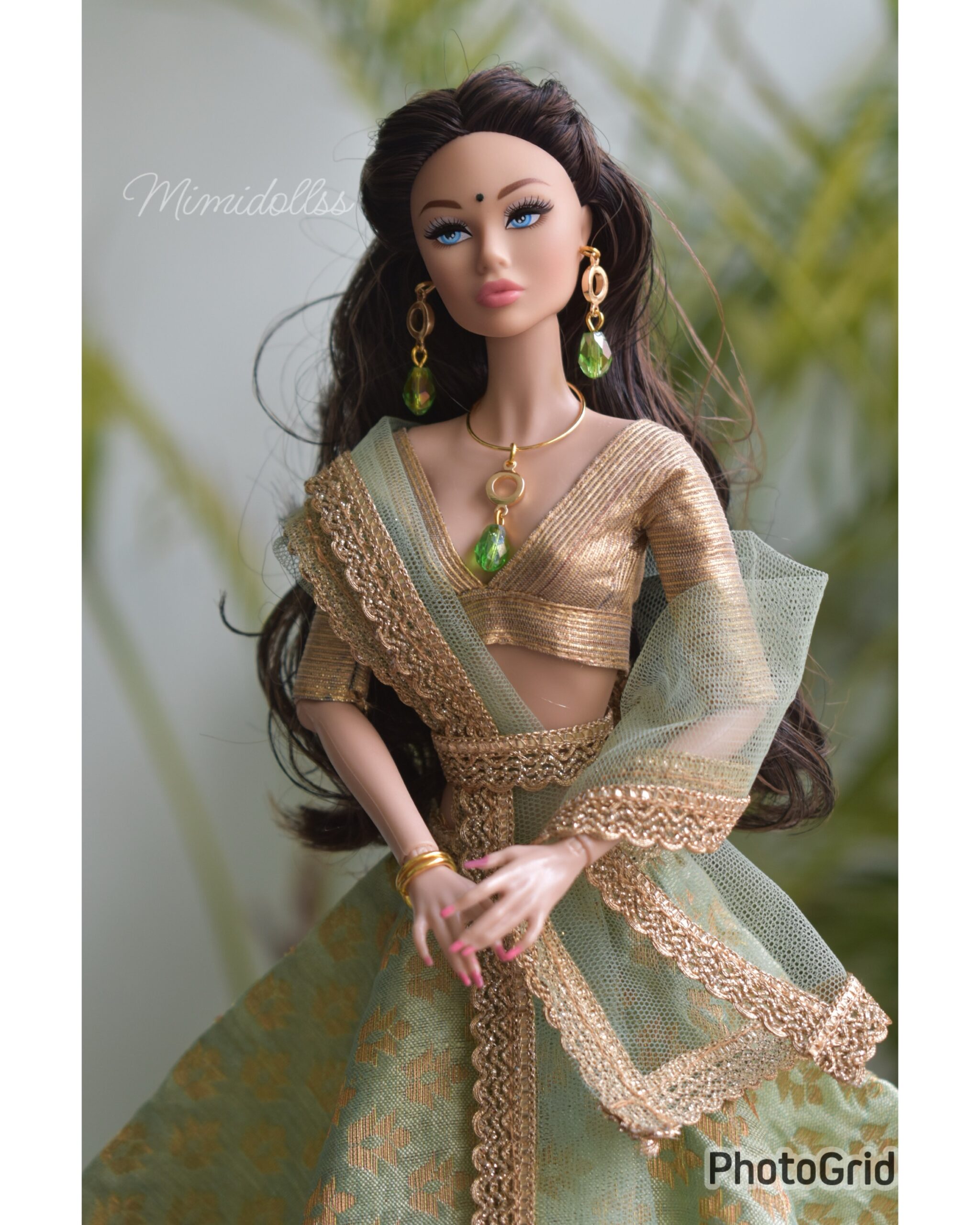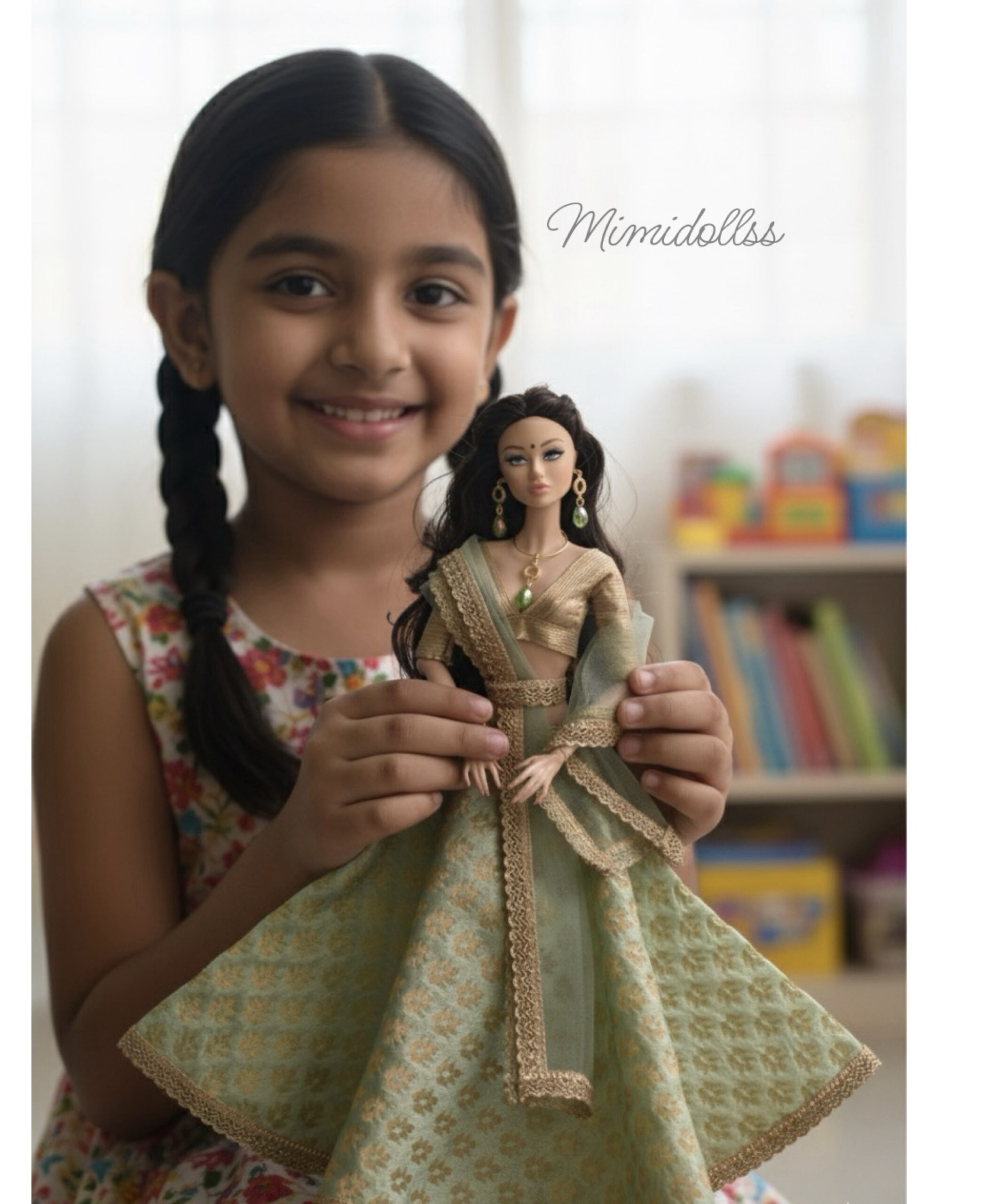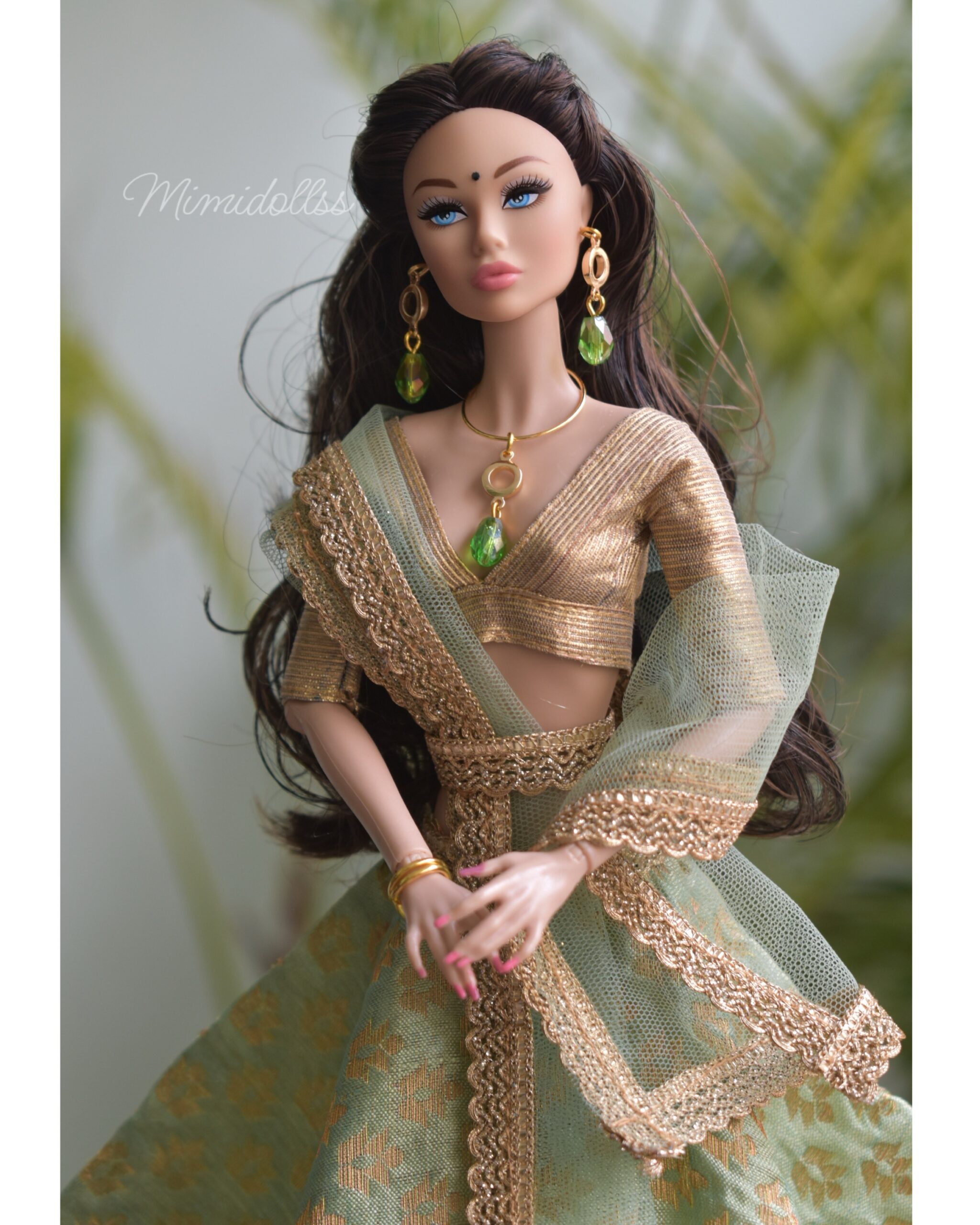 A brand new 33cm tall supermodel body-type doll, elegantly dressed in beautifully handcrafted traditional Indian clothing and intricate accessories. Each doll comes securely packaged in a sturdy, protective box.