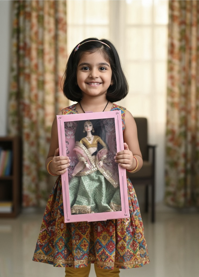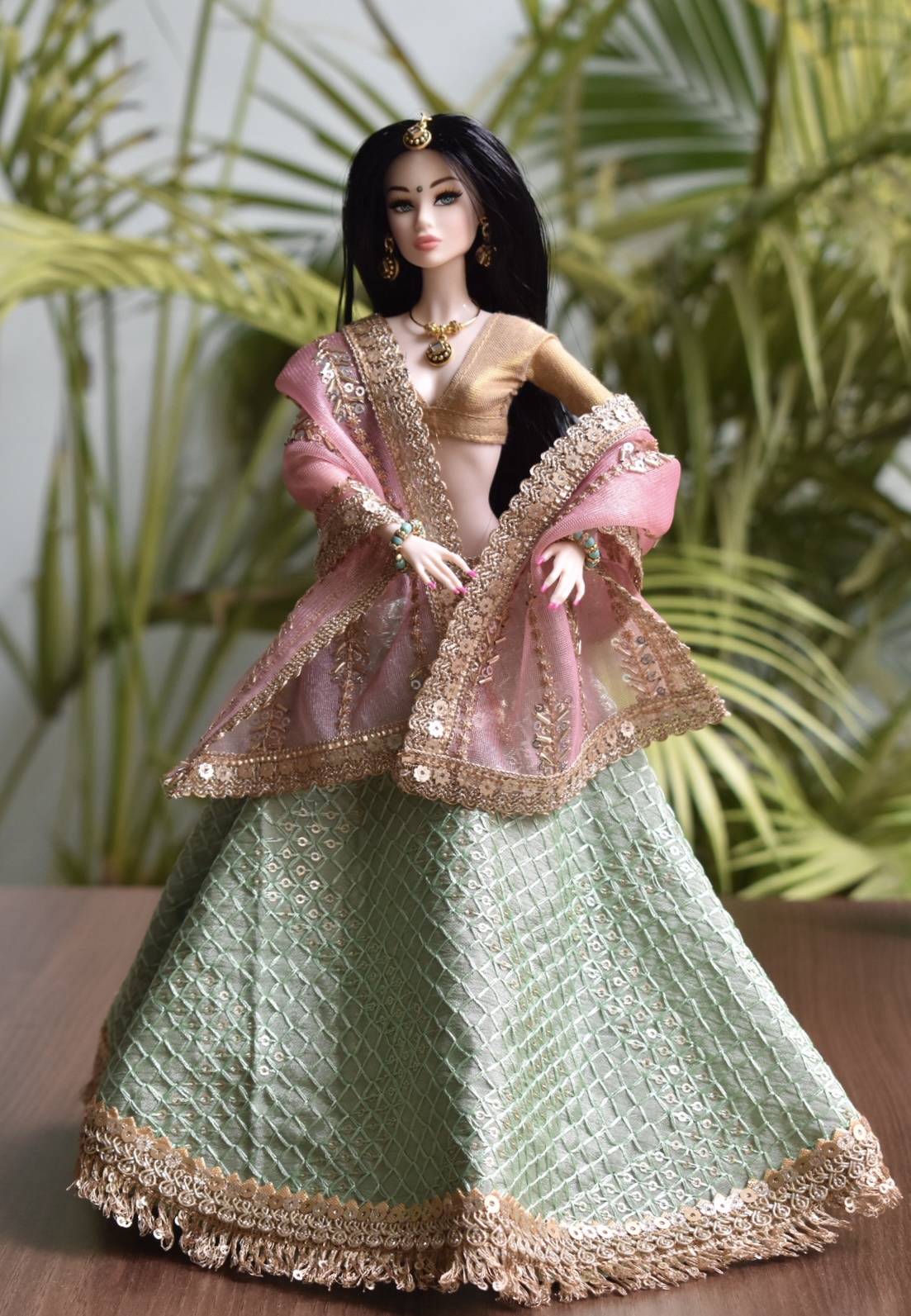 A brand new 33cm tall supermodel body-type doll, elegantly dressed in beautifully handcrafted traditional Indian clothing and intricate accessories. Each doll comes securely packaged in a sturdy, protective box.