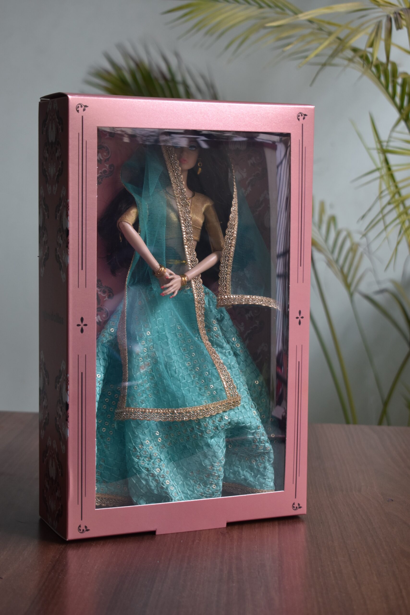 A brand new 33cm tall supermodel body-type doll, elegantly dressed in beautifully handcrafted traditional Indian clothing and intricate accessories. Each doll comes securely packaged in a sturdy, protective box.
