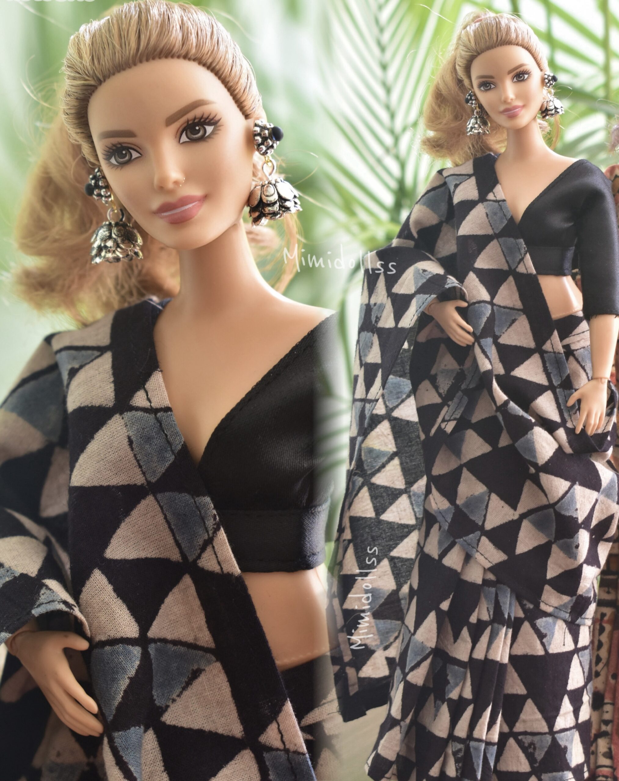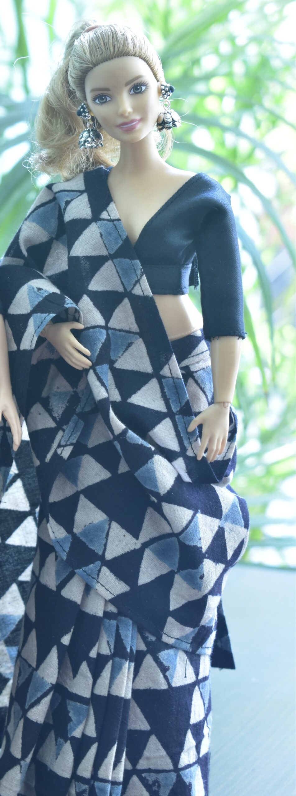 Ajarak printed Indian cotton saree in scale for a curvy body type Barbie doll.