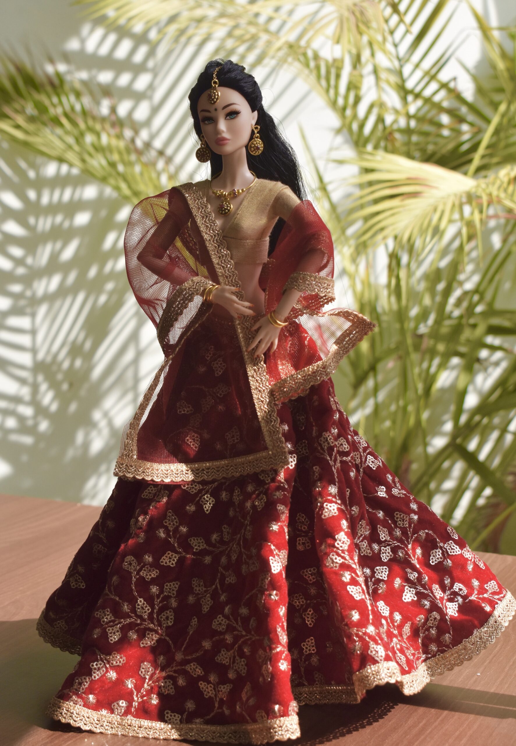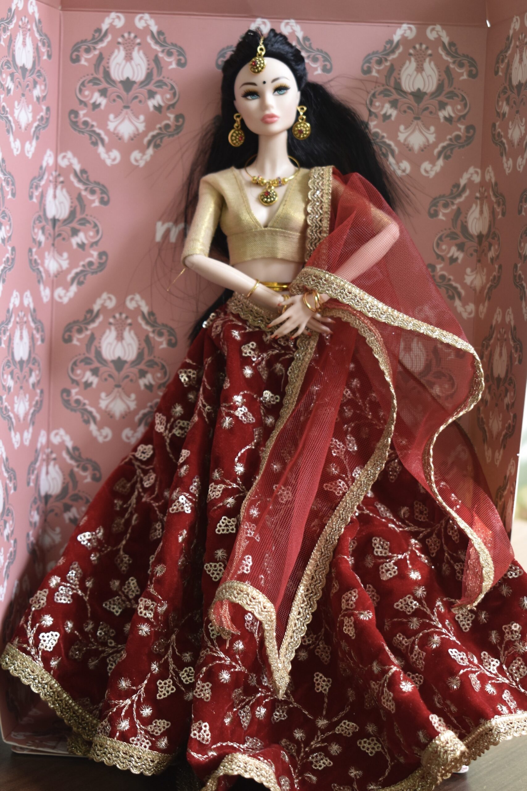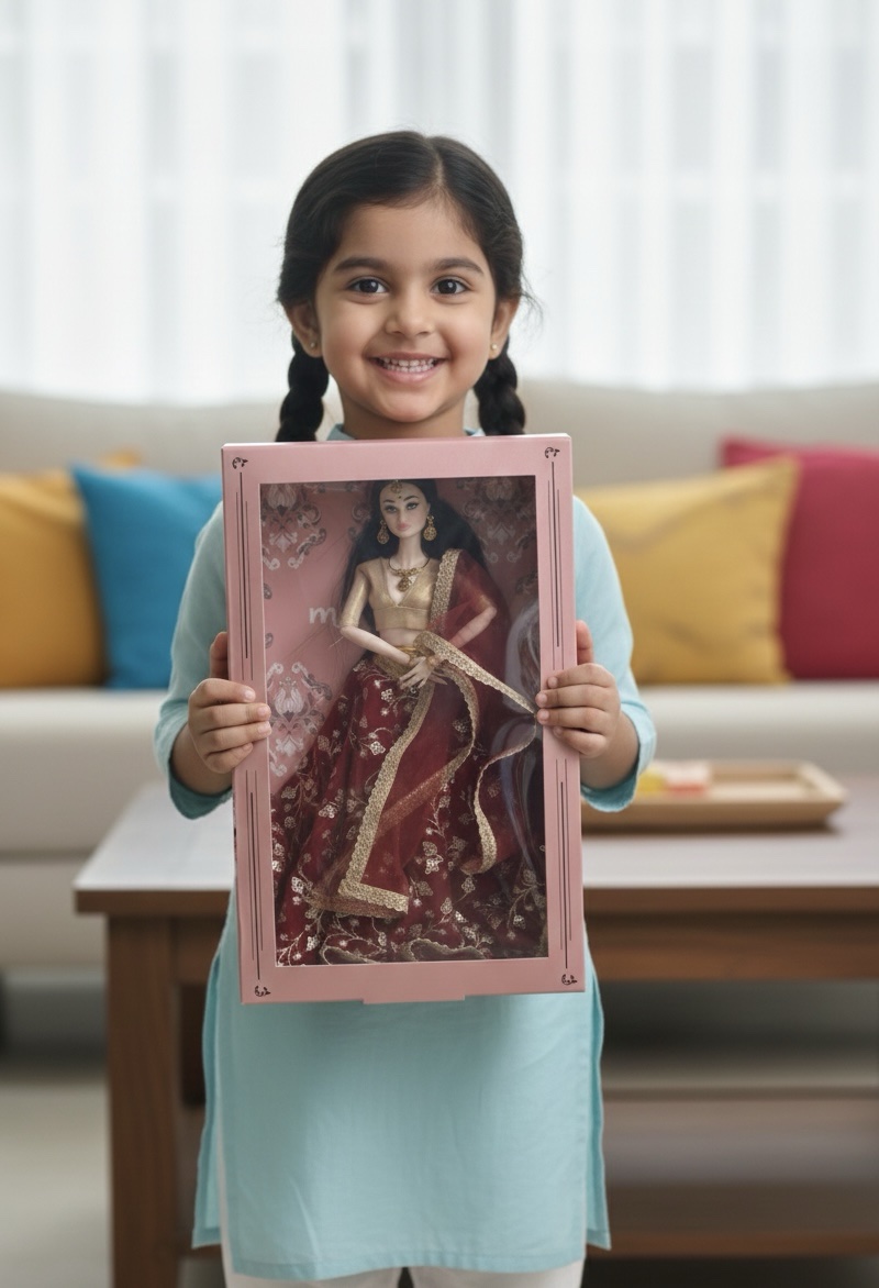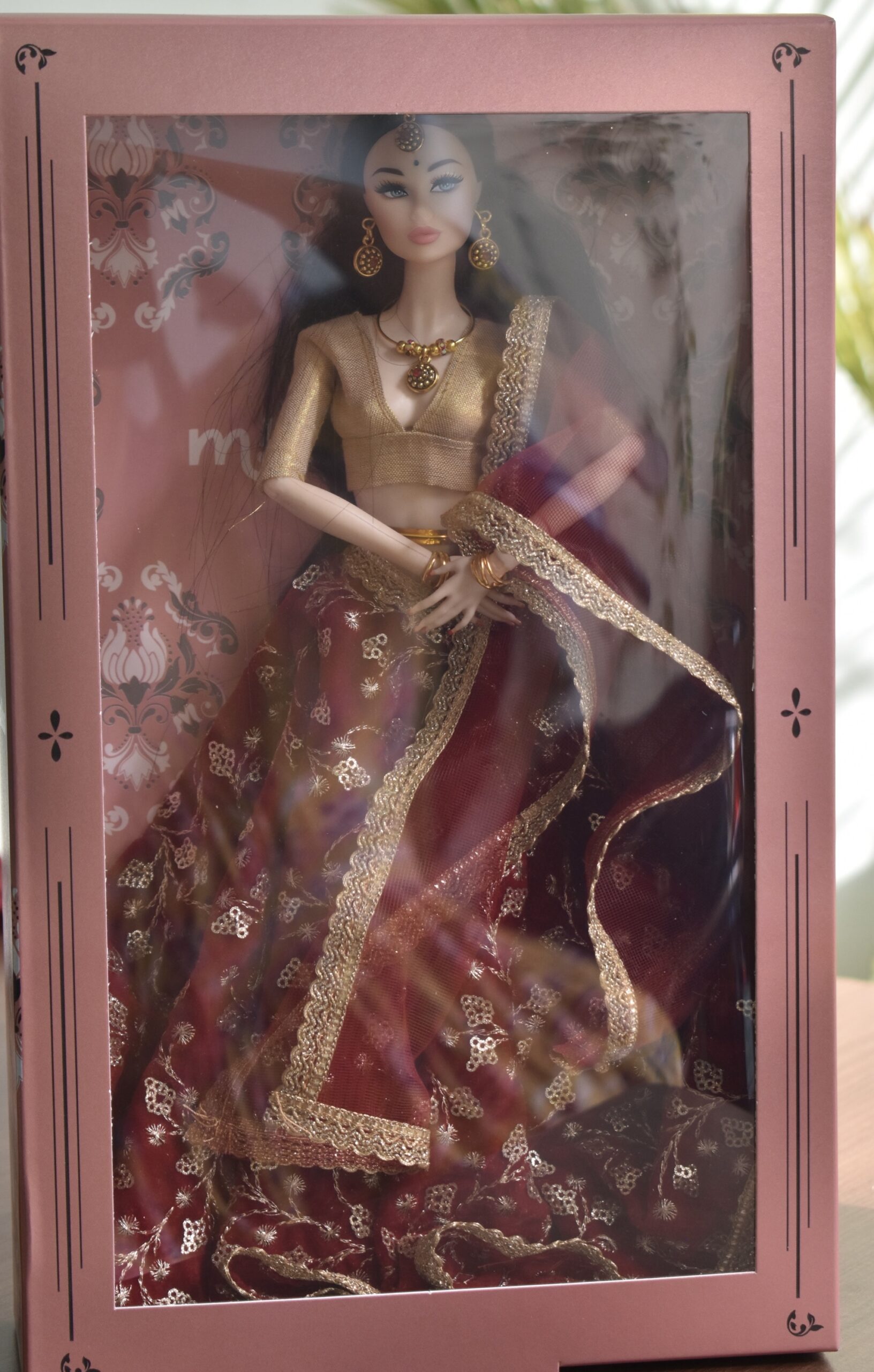 A brand new 33cm tall supermodel body-type doll, elegantly dressed in beautifully handcrafted traditional Indian clothing and intricate accessories. Each doll comes securely packaged in a sturdy, protective box.